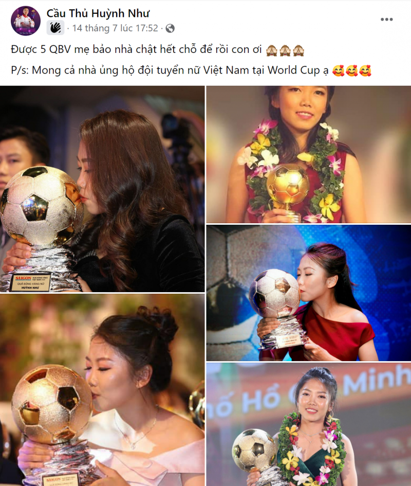 Trang fanpage của Huỳnh Như – “Cầu thủ Huỳnh Như” cũng nhanh chóng bắt trend và có bài viết “Được 5 Qủa bóng vàng mẹ bảo nhà chật hết chỗ để rồi con ơi”. Bên cạnh đó, cô gái vàng trong làng bóng đá cũng không quên kêu gọi cộng đồng mạng ủng hộ đội tuyển nữ Việt Nam trong hành trình World Cup sắp tới.