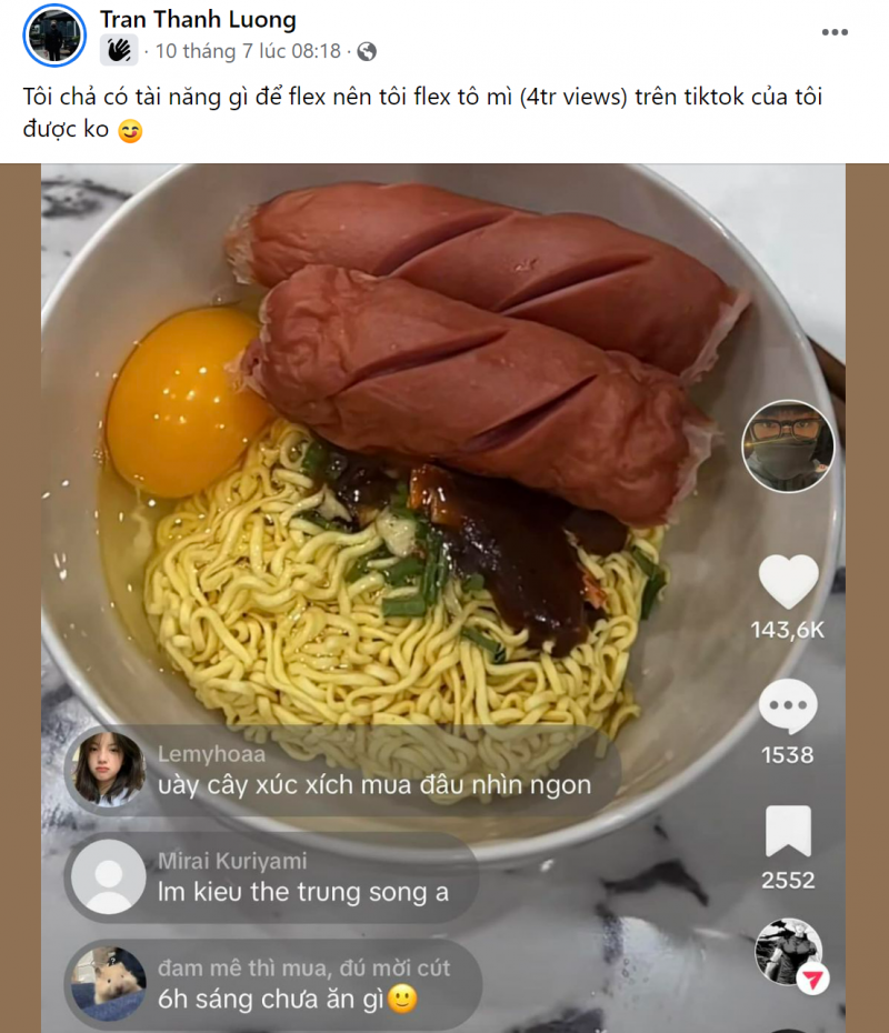 Ngoài những chia sẻ trên, nhiều thành viên trong nhóm cũng không khỏi bật cười bởi bài viết của bạn Hồ Phi Việt, khi khoe về dòng họ của mình hay bài viết khoe tô mì 4 triệu views trên Tiktok của nick facebook Tran Thanh Luong.