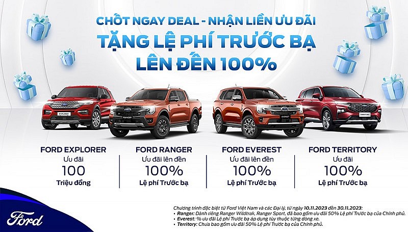 Khi mua xe, khách hàng còn được nhận thêm hàng loạt ưu đãi hấp dẫn từ Ford Việt Nam và hệ thống đại lý: “Chốt ngay deal – Nhận liền ưu đãi” với mức ưu đãi lên đến 100% lệ phí trước bạ cho các dòng xe bán tải và SUV của Ford.