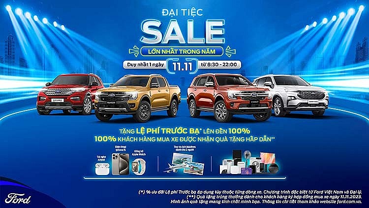Trong ngày 11/11/2023, từ 8:30 đến 22:00, đại tiệc sale của Ford với quy mô lớn được tổ chức đồng loạt tại tất cả các đại lý trên toàn quốc. Trong ngày này, khách hàng mua xe ở bất kỳ đại lý ủy quyền của Ford Việt Nam trên toàn quốc sẽ được trải nghiệm một không khí lễ hội đặc biệt, được tham gia rút thăm để trúng một trong những phần quà hấp dẫn với giải đặc biệt là một chuyến du lịch Maldives 5 ngày 4 đêm dành cho 2 người và nhiều phần quà thú vị khác: iPhone 15 Pro Max, đồng hồ Apple watch Series 9, máy rửa chén, Tivi 55 inch… với tổng giá trị lên đến 1.6 tỷ đồng.