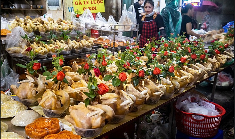 Bà Phạm Thị Tố, chủ quán bán chim quay, gà luộc trong chợ Hàng Bè cho biết những ngày này, nhiều người đã đến đây mua gà về lễ. Nhiều người còn đặt gà và xôi từ tháng trước vì sợ sát ngày không mua được gà. Mỗi con gà luộc ngậm hoa hồng bán với giá từ 400 -900 nghìn đồng một con, tùy trọng lượng. Nếu khách mua theo set cả gà và xôi thì giá thành sẽ nhỉnh hơn một chút nữa.