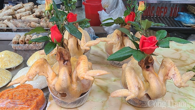 | Ngoài gà ngậm hoa hồng, các cửa hàng ở đây còn bán thêm xôi, nem rán, chim quay, thịt lợn quay...để phục vụ nhu cầu sắp mâm cơm lễ của người dân. |
