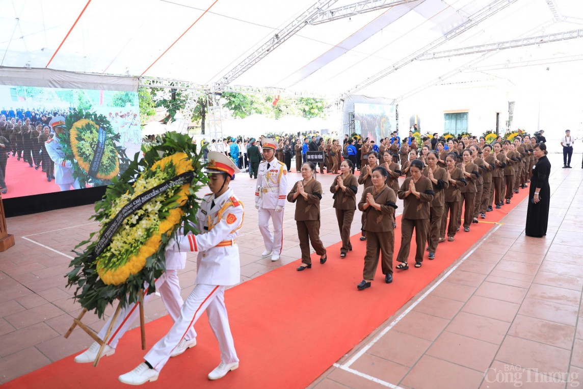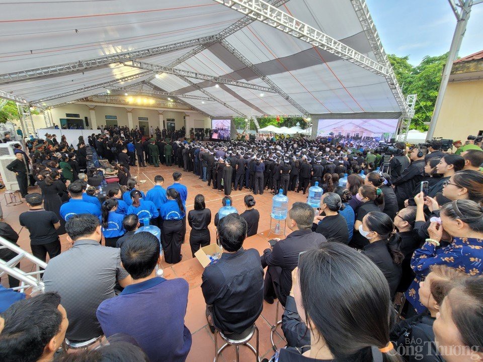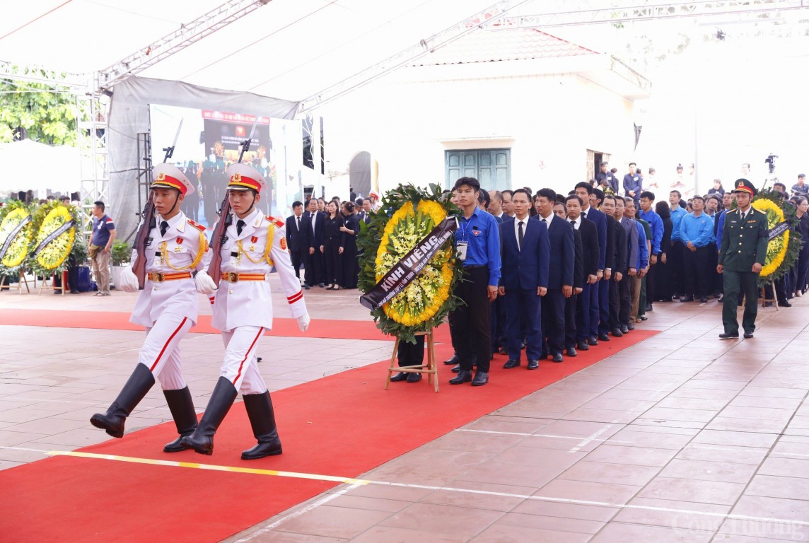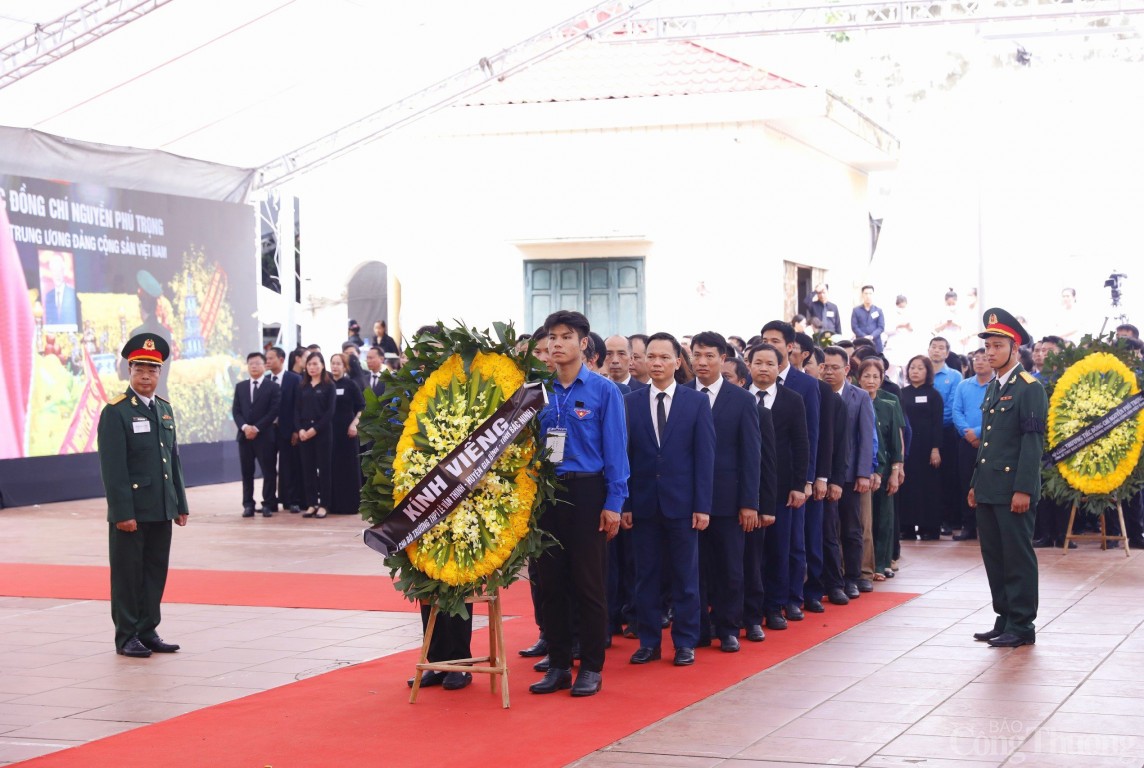 Ngay sau lời khai mạc của Ban Tổ chức Lễ tang, các đoàn thể đại diện cơ quan, tổ chức có mặt tại sân Nhà văn hóa thôn Lại Đà nghiêm trang dành một phút mặc niệm Tổng Bí thư Nguyễn Phú Trọng - Người con ưu tú của quê hương.