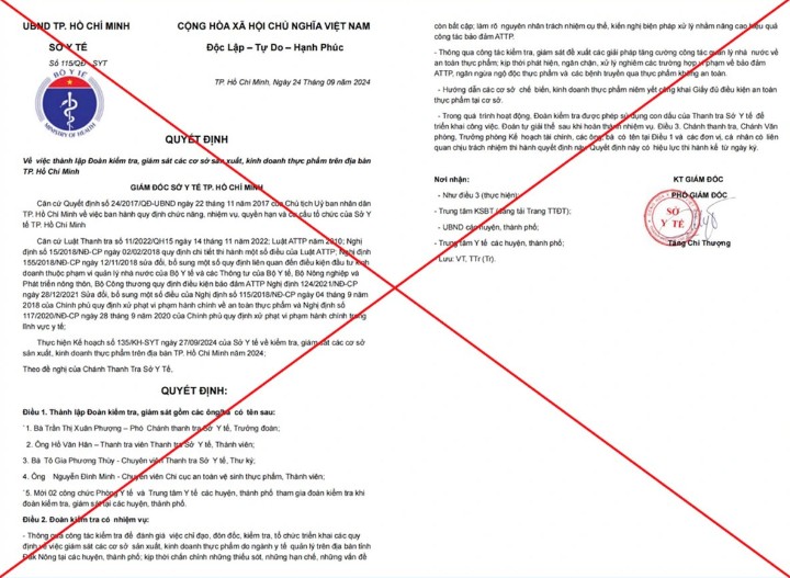Trao đổi với Báo Công Thương ngày 7/10, ông Nguyễn Hùng Long - Phó Cục trưởng Cục An toàn thực phẩm (Bộ Y tế) cho biết, cơ quan này đã nhận được thông tin phản ánh có hiện tượng giả mạo văn bản chỉ đạo của Sở Y tế (như thông báo, quyết định về việc thành lập đoàn thanh tra, kiểm tra, giám sát) sẽ kiểm tra tại các cơ sở sản xuất, kinh doanh thực phẩm trên địa bàn.