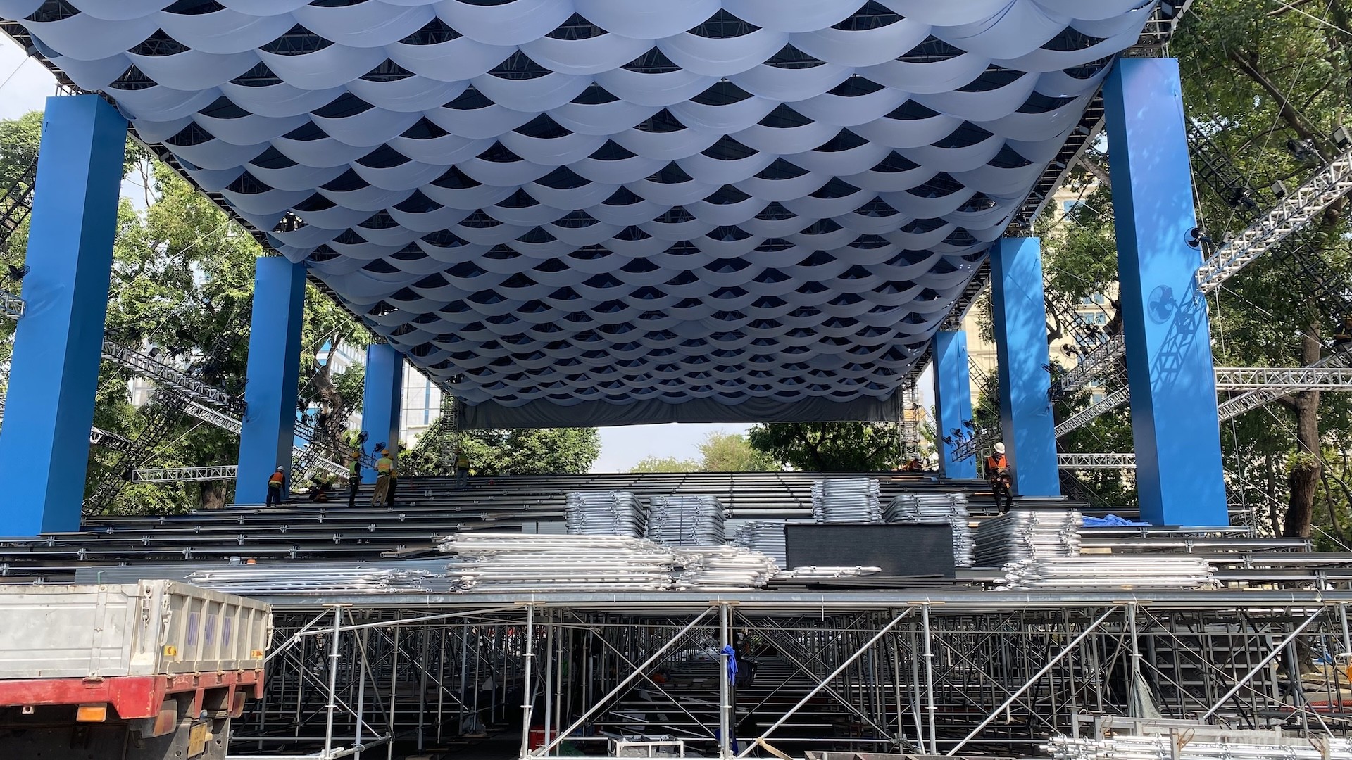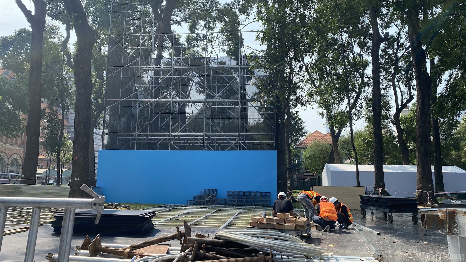 Ghi nhận của phóng viên Báo Công Thương, khu vực sân khấu chính (trước Dinh Độc lập và đường Lê Duẩn), nhân viên tất bật làm việc suốt ngày đêm, nhằm đảm bảo hoàn thành công tác chuẩn bị cho đại lễ kỷ niệm 30/4 tới. Tại đây, sân khấu chính, khán đài A, B, C cùng nhiều khung màn hình Led cỡ lớn đang được gấp rút hoàn thiện.