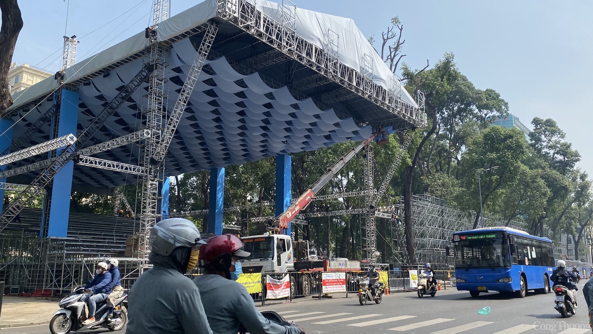 | Tại đường Lê Duẩn (quận 1) công tác lắp đặt khán đài cho đại lễ kỷ niệm đang gấp rút hoàn thành |