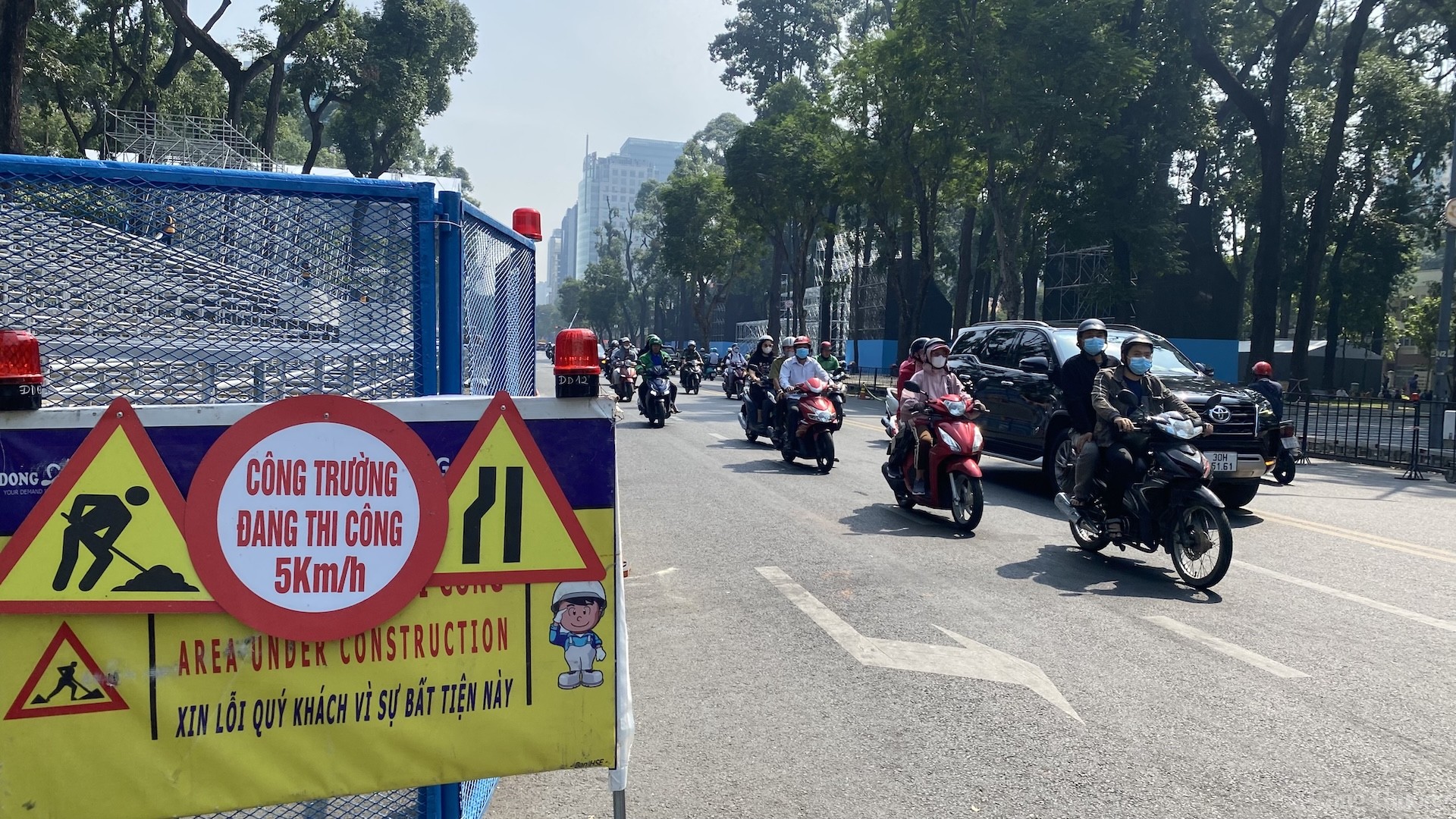 | Trong quá trình thi công lắp đặt, đường Lê Duẩn và trước Dinh Độc lập hạn chế phương tiện qua lại |