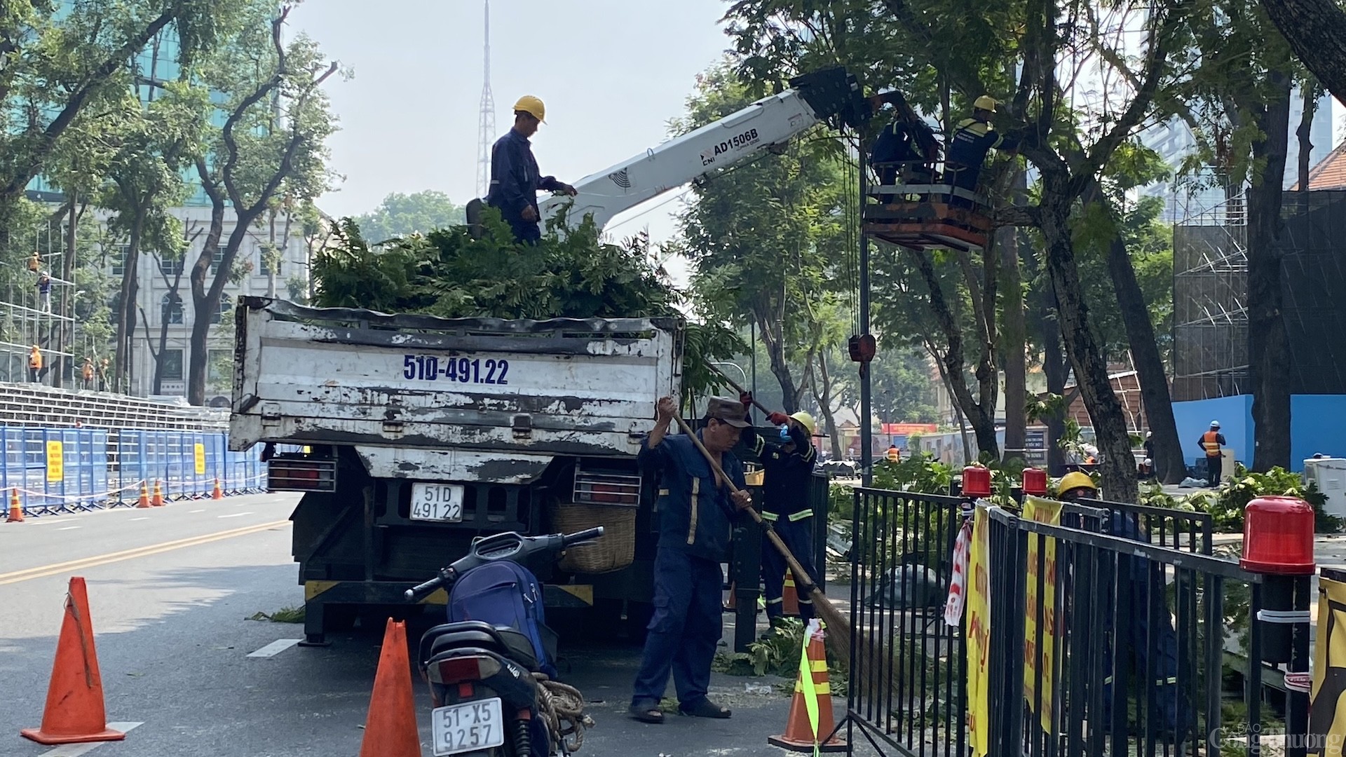 | Công nhân cây xanh tỉa cành nhằm đảm bảo an toàn nơi diễn ra lễ kỷ niệm |