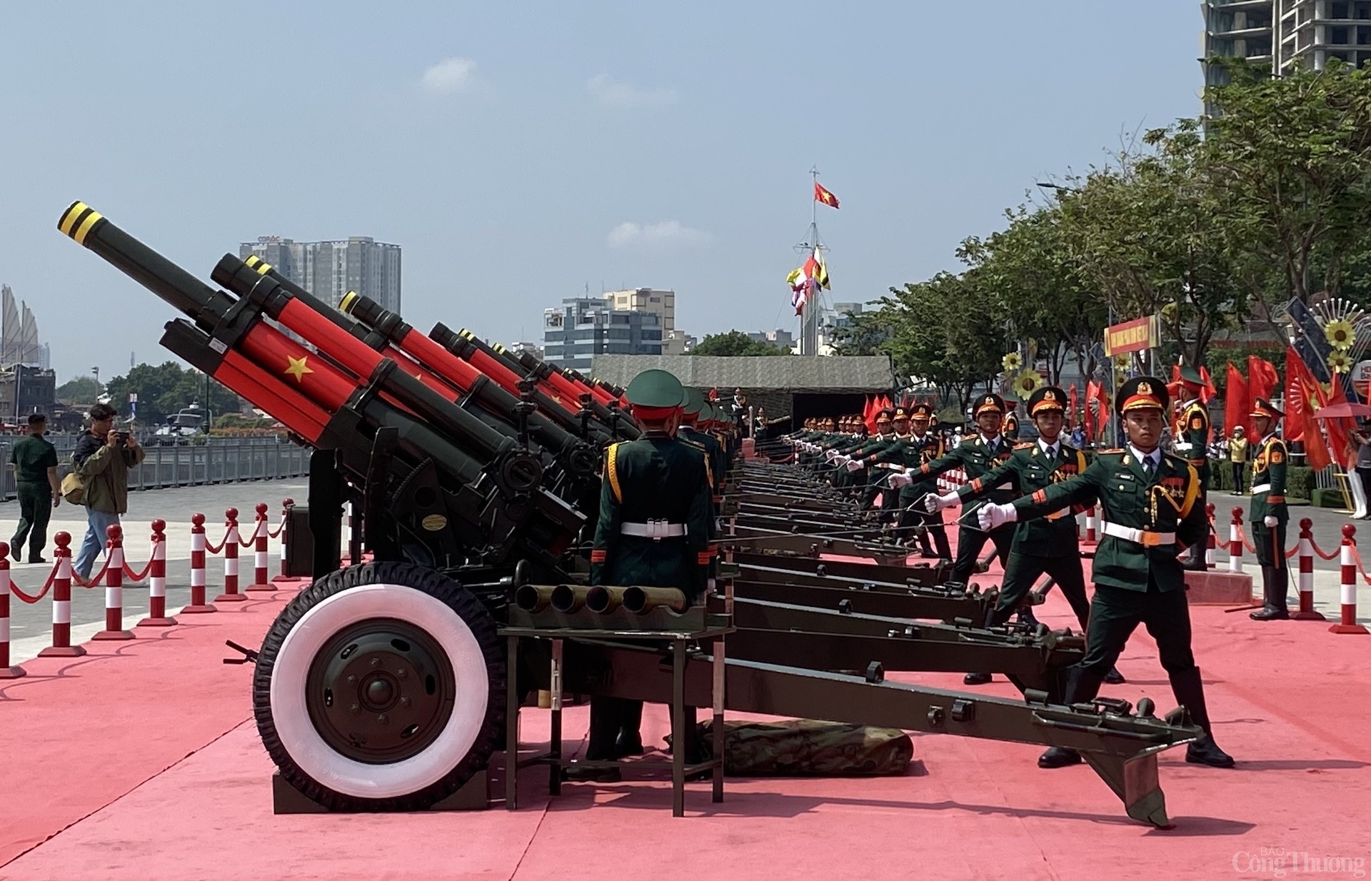 Còn tại khu vực Bến Bạch Đằng (quận 1, TP. Hồ Chí Minh), những ngày qua, 80 chiến sĩ thuộc Lữ đoàn 96 (Binh chủng Pháo binh) miệt mài tập luyện, thực hiện diễn tập bắn đại bác, để chuẩn bị cho lượt bắn 21 phát đại bác chào mừng ngày giải phóng miền Nam, thống nhất đất nước vào sáng ngày 30/4 trên nền nhạc Quốc thiều.