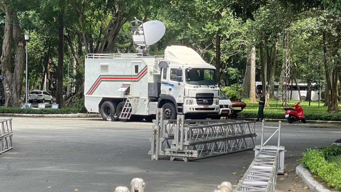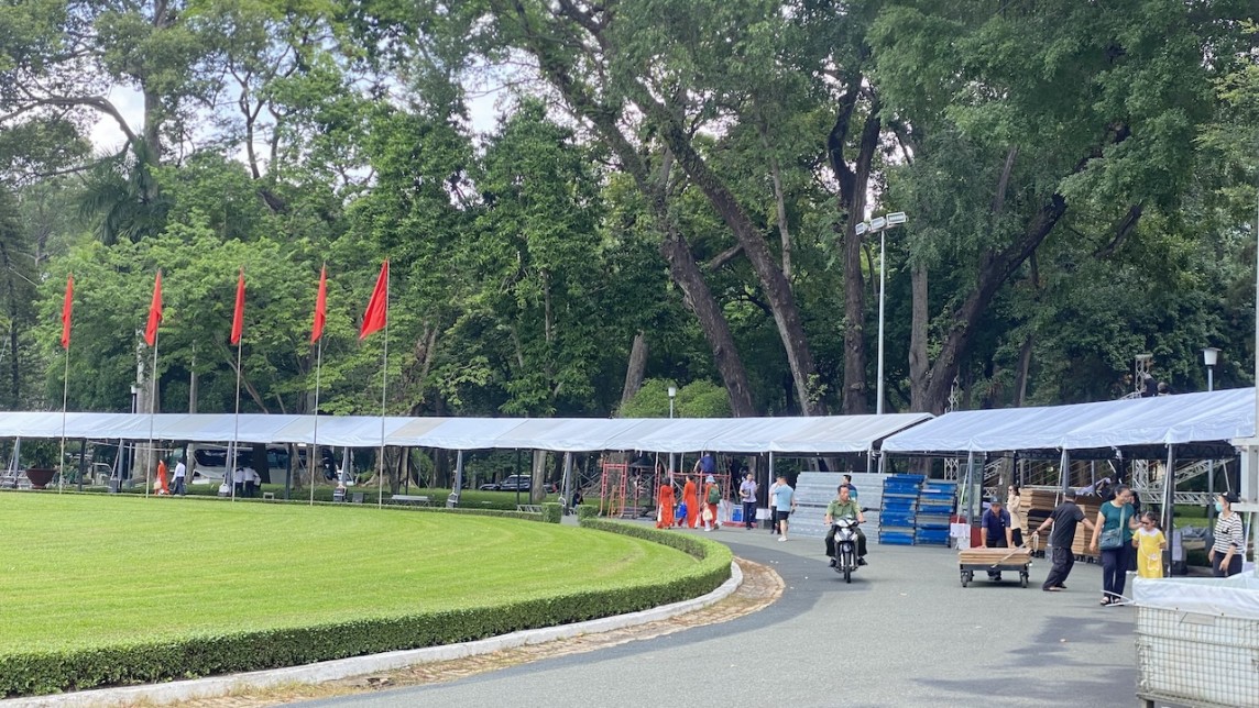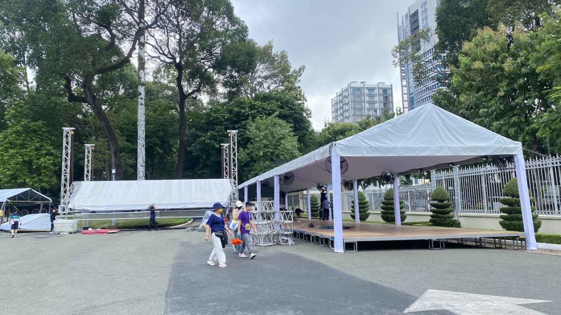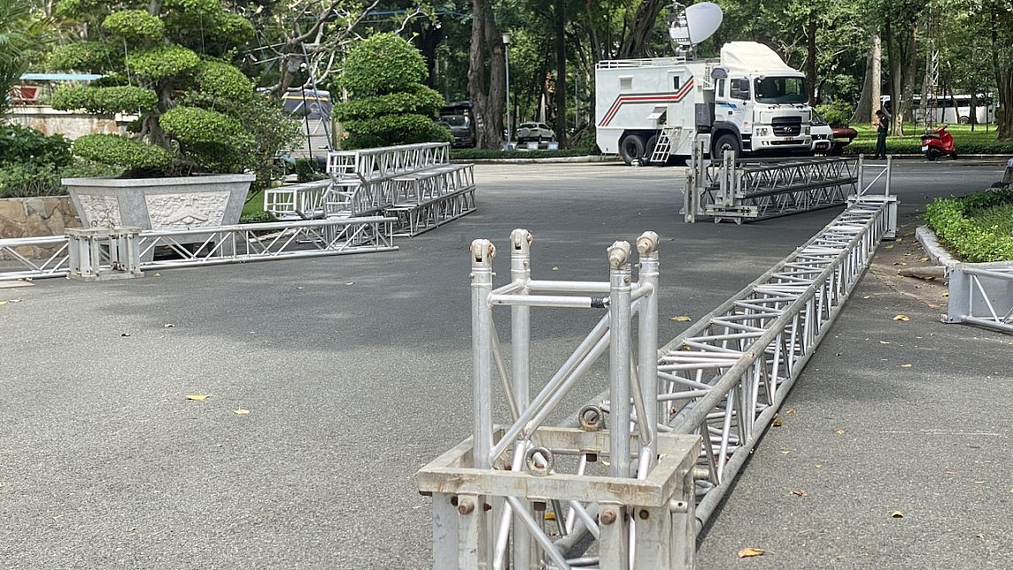 Ngày 23/7, công tác chuẩn bị Lễ viếng và Lễ truy điệu Tổng Bí thư Nguyễn Phú Trọng diễn ra tại Hội trường Thống Nhất (TP. Hồ Chí Minh) đang được gấp rút hoàn thành. Nhiều nhà rạp đã được dựng lên, theo lối vào Hội trường Thống Nhất.