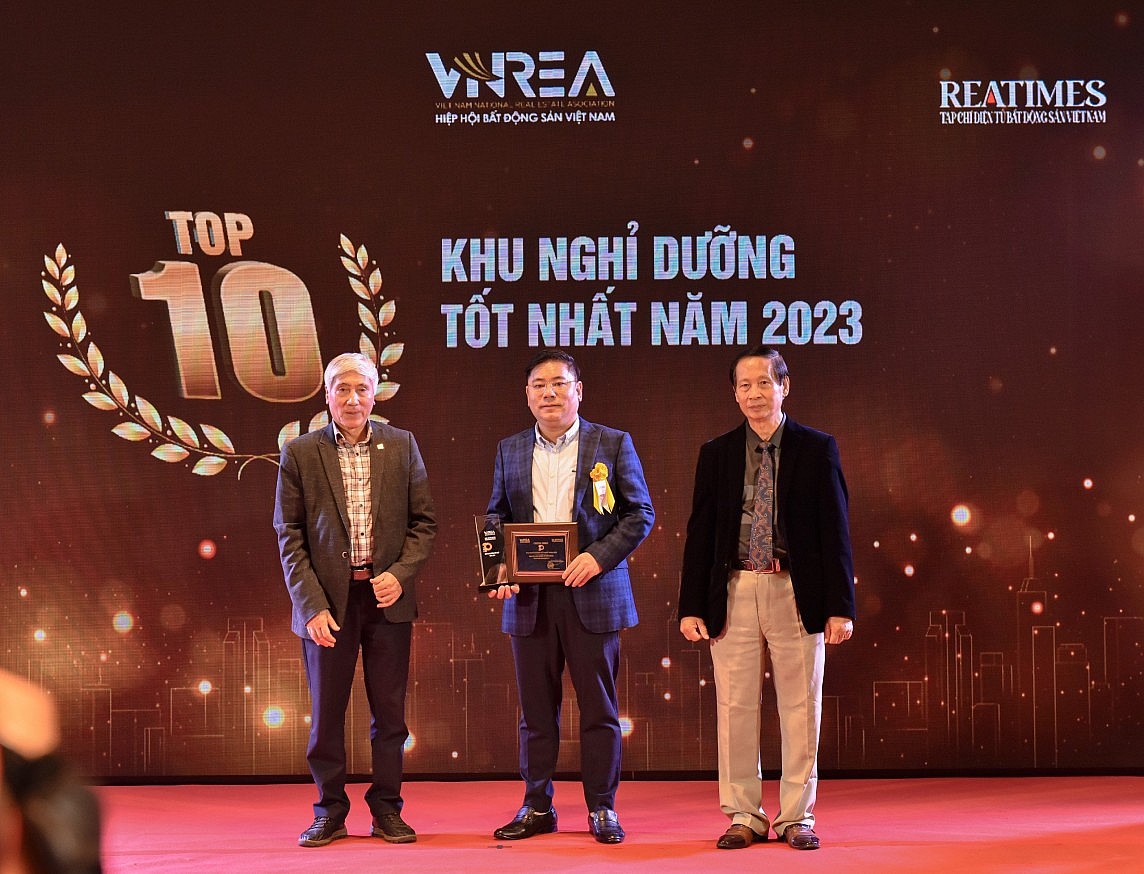| Đại diện dự án KDL Quốc tế Đồi Rồng nhận giải thưởng Top 10 Khu nghỉ dưỡng tốt nhất năm 2023. |