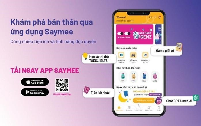 Ứng dụng Saymee: ● MobiEdu: Học thử, thi thử Ielts/Toeic miễn phí ● Chat GPT Umee: Hỏi đáp không giới hạn với Chat GPT ● Mee’love: Chương trình tích điểm đổi voucher mỗi ngày. ● Sắc màu Umee: Chơi game nhận điểm Meetik, thỏa thích đổi quà ● Dịch vụ SIM: Chọn số theo cung hoàng đạo, ngày sinh, thần số học. Đăng kí eSIM, SIM vật lý thuận tiện. Tìm hiểu thêm về Saymee tại: https://saymee.vn |
