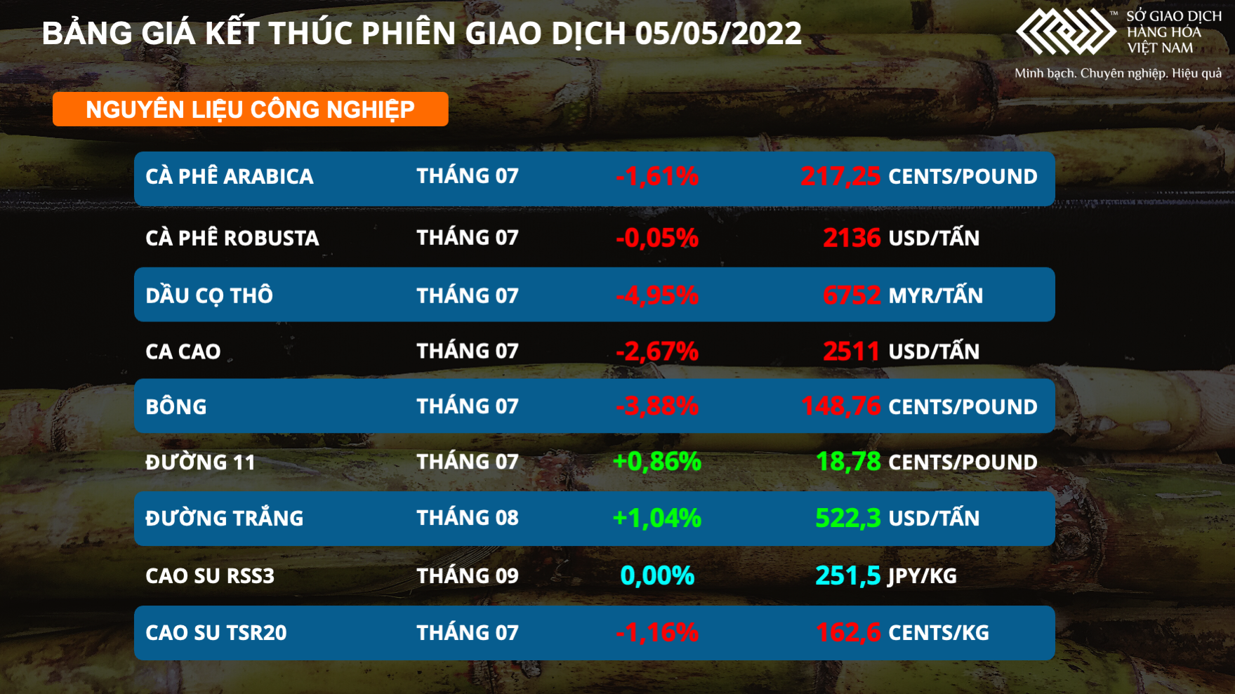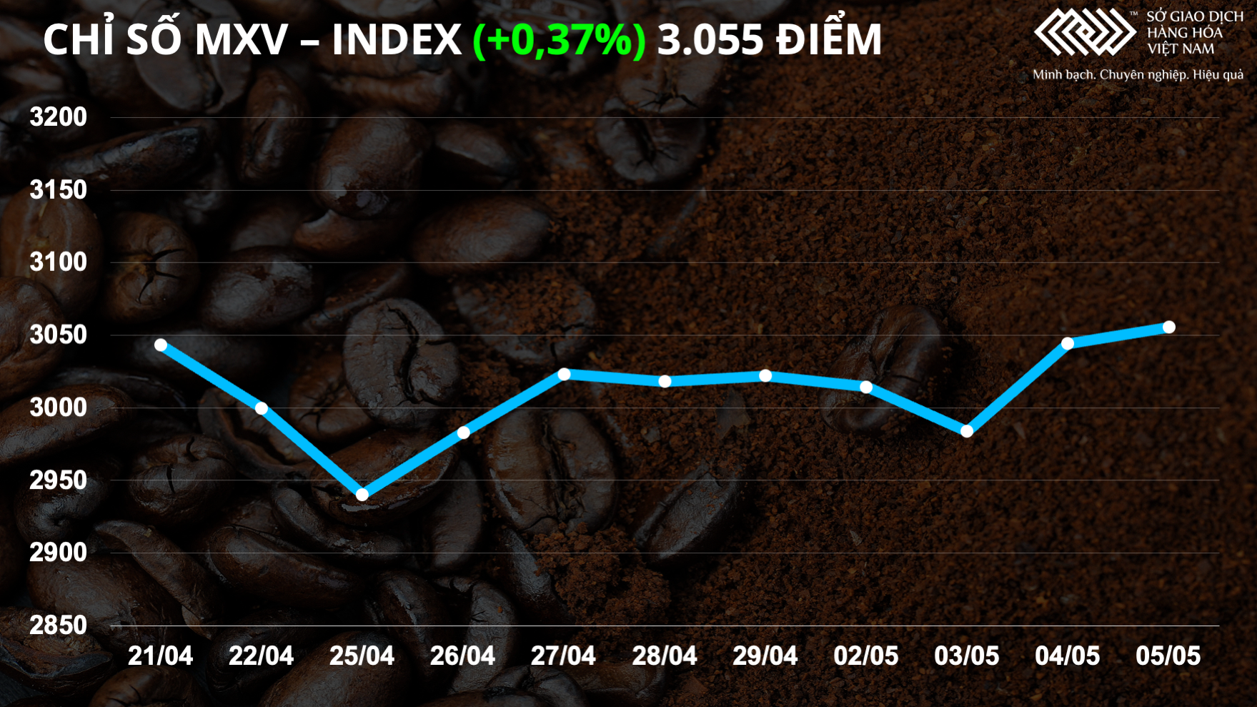 Theo Sở Giao dịch Hàng hóa Việt Nam (MXV), chỉ số MXV-Index ngày 5/5 vẫn giữ được mức tăng nhẹ 0,37% lên 3.055,53 điểm nhờ việc khí tự nhiên và lúa mì tăng mạnh.