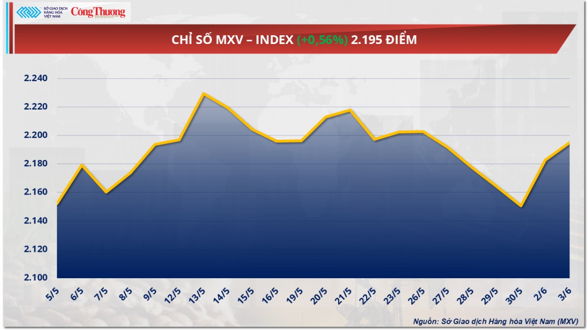 Sở Giao dịch Hàng hóa Việt Nam (MXV) cho biết sau hai phiên khởi sắc, chỉ số MXV-Index đang phục hồi sát ngưỡng 2.200 điểm. Trong phiên giao dịch hôm qua, 3 trên 4 nhóm hàng đóng cửa trong sắc xanh, nhiều mặt hàng đồng loạt tăng giá. Đáng chú ý, trên thị trường năng lượng, hai mặt hàng dầu thô mở rộng đà tăng sang phiên thứ hai.