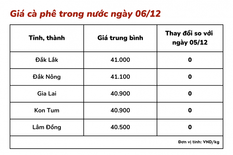 Giá cà phê hôm nay 06/12 tại các tỉnh khu vực Tây Nguyên được thu mua với giá 40.500 – 41.100 đồng/kg, đi ngang với hôm qua 05/12.