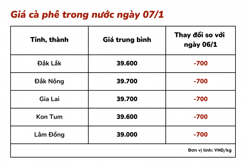 Giá cà phê trong nước hôm nay 07/1 quay đầu giảm, giảm 700 đồng/kg so với hôm qua. Hiện cà phê nhân xô (cà phê nhân, cà phê nhân tươi) tại tỉnh Lâm Đồng ở các huyện như Bảo Lộc, Di Linh, Lâm Hà được thu mua với giá từ 38.900– 39.000 đồng/kg.
