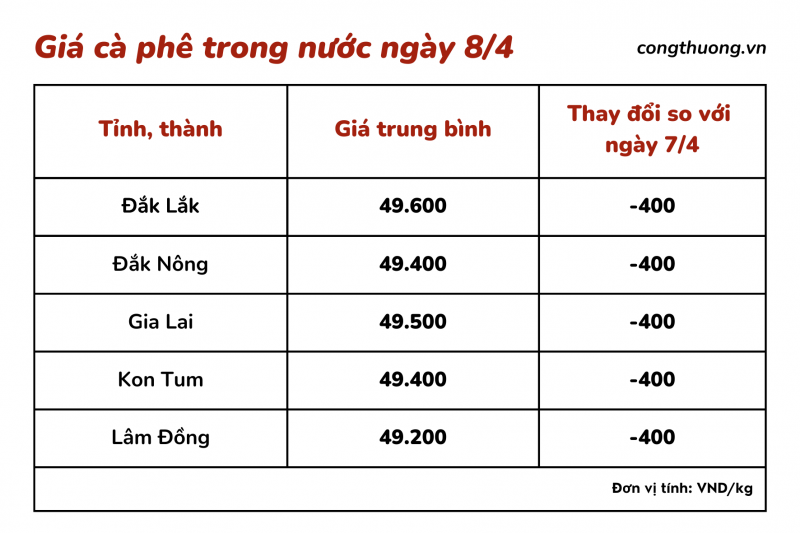 | Giá cà phê hôm nay 08/4 dao động từ 49.200 – 49.600 đồng/kg |
