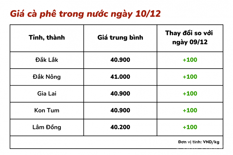 Giá cà phê hôm nay 10/12 tại các tỉnh khu vực Tây Nguyên được thu mua với giá 40.200 – 41.000 đồng/kg, tăng nhẹ 100 đồng/kg so với hôm qua (09/12).