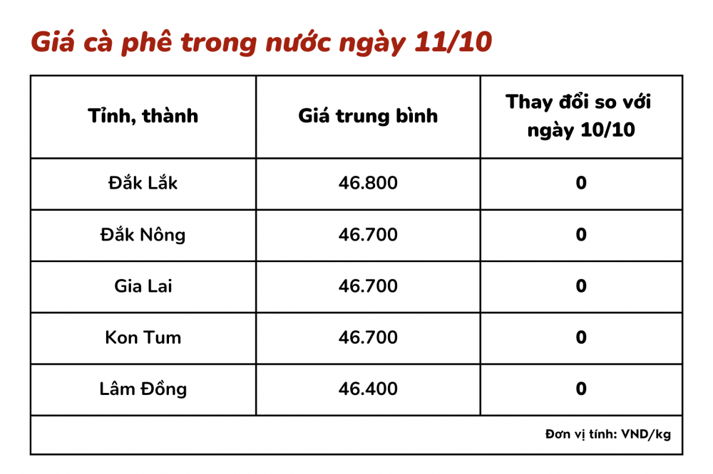 | Giá cà phê trong nước hôm nay (11/10) dao động từ 46.400 – 46.800 đồng/kg. |