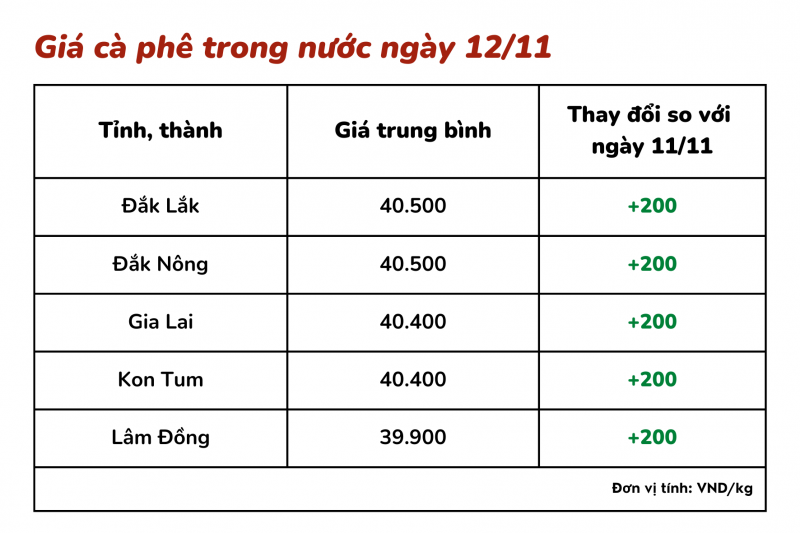 Giá cà phê hôm nay 12/11 tại các tỉnh Tây Nguyên được thu mua với giá dao động từ 39.900 – 40.500 đồng/kg, tăng 200 đồng/kgso với hôm qua 11/11.