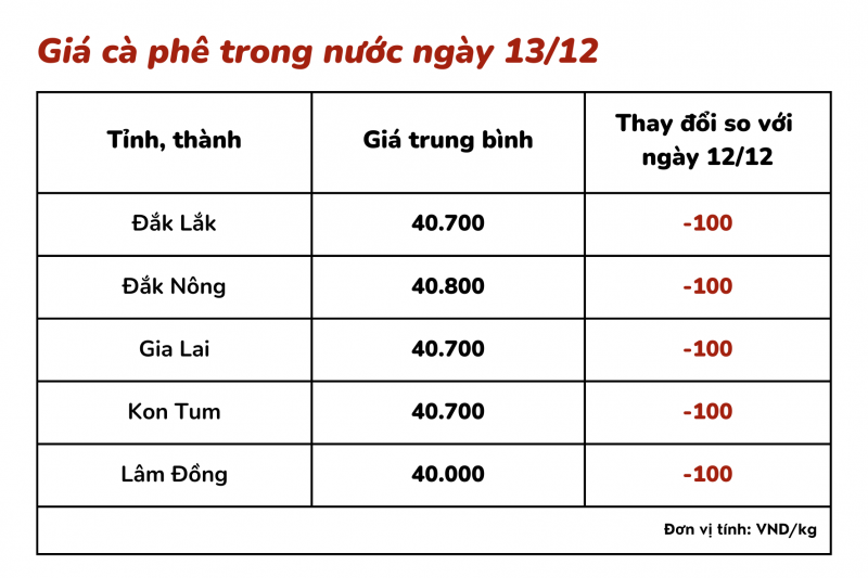 Giá cà phê hôm nay 13/12 tại các tỉnh khu vực Tây Nguyên đi ổn định, hiện cà phê được thu mua với giá 40.000 – 40.800 đồng/kg, giảm nhẹ 100 đồng/kg so với hôm qua 12/12.