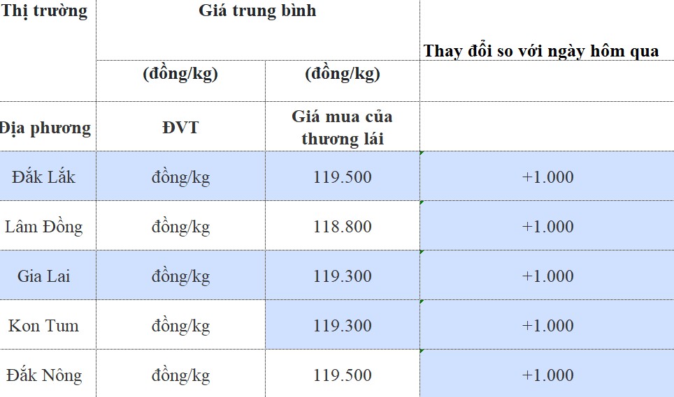 Cụ thể, giá cà phê thu mua tại tỉnh Gia Lai (Chư Prông) là 119.300 đồng, ở Pleiku và La Grai cùng giá 119.200 đồng/kg; tại tỉnh Kon Tum cà phê được thu mua ở mức giá 119.300 đồng/kg; tại tỉnh Đắk Nông cà phê được thu mua với giá cao nhất 119.500 đồng/kg.