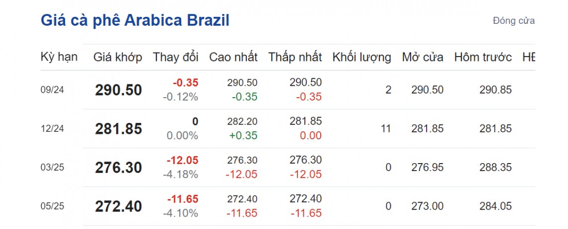 Giá cà phê Arabica Brazil sáng ngày 14/8/2024 giảm mạnh. Cụ thể, kỳ hạn giao hàng tháng 09/2024 là 290.50USD/tấn, giảm 0.12%; kỳ giao hàng tháng 12/2024 là 281.85 USD/tấn; kỳ giao hàng tháng 3/2025 là 276.30 USD/tấn, giảm 4.18 % và giao hàng tháng 5/2025 là 272.40 USD/tấn (giảm 4.10%).