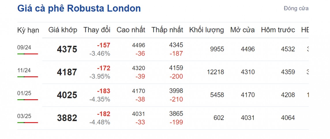 Kết thúc phiên giao dịch, giá cà phê Robusta trên sàn London ngày 14/8/2024 lúc 4h30 giảm xuống mức 3.882 - 4.375 USD/tấn. Cụ thể, kỳ hạn giao hàng tháng 9/2024 là 4.375 USD/tấn (giảm 157 USD/tấn); kỳ hạn giao hàng tháng 11/2024 là 4.187 USD/tấn, giảm 172 USD/tấn); kỳ hạn giao hàng tháng 1/2025 là 4.925USD/tấn (giảm 183 USD/tấn) và kỳ hạn giao hàng tháng 3/2025 là 3.882 USD/tấn (giảm 182 USD/tấn).