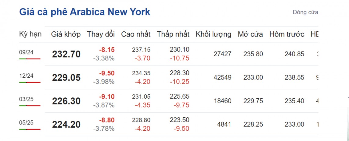Giá cà phê Arabica trên sàn New York sáng ngày 14/8/2024 mức giảm từ 224.20 - 232.70 ent/lb. Cụ thể, kỳ hạn giao hàng tháng 9/2024 là 232.70 cent/lb (giảm 3.38%); kỳ giao hàng tháng 12/2024 là 229.05 cent/lb (giảm 3.98 %); kỳ giao hàng tháng 3/2025 là 226.30 cent/lb (giảm 3.87 %) và kỳ giao hàng tháng 5/2025 là 224.20 cent/lb, giảm 3.78%.