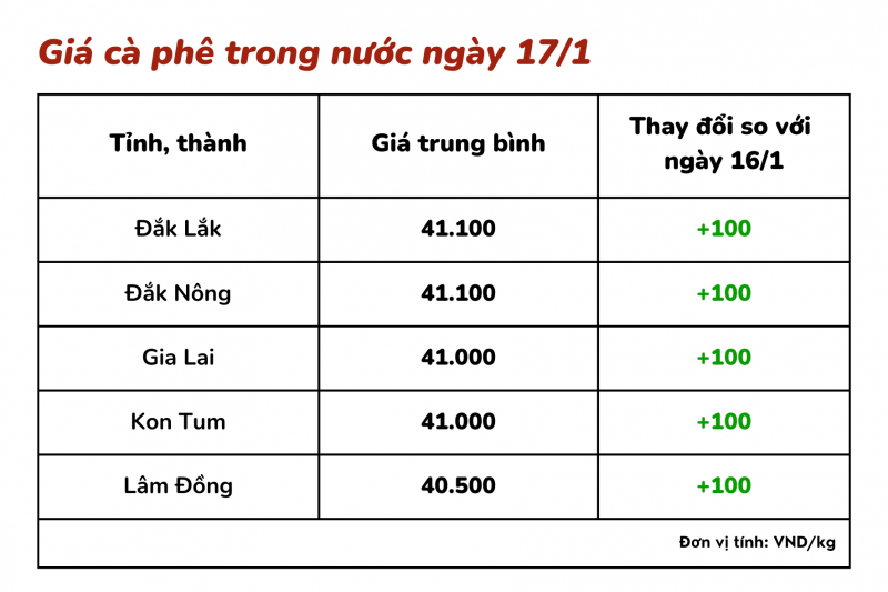 Giá cà phê hôm nay, ngày 17/1 ở các tỉnh Tây Nguyên dao động từ 40.500 – 41.100 đồng/kg. Cụ thể, tại các huyện Di Linh, Lâm Hà, Bảo Lộc (Lâm Đồng) cà phê được thu mua ở mức 40.500 đồng/kg. Tại phần lớn các huyện của tỉnh Đắk Lắk, tỉnh Kon Tum cà phê được thu mua ở mức 41.000 đồng/kg.