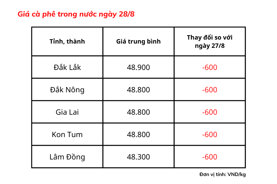 Giá cà phê trong nước hôm nay 28/8 tiếp tục giảm thêm 600 đồng/kg. Hiện giá dao động trong khoảng 48.300 - 48.900 đồng/kg.