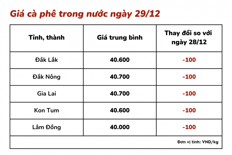 Giá cà phê hôm nay 29/12 tại các tỉnh khu vực Tây Nguyên giảm nhẹ 100 đồng/kg so với hôm qua, hiện cà phê được thu mua với giá từ 40.000 – 40.700 đồng/kg.