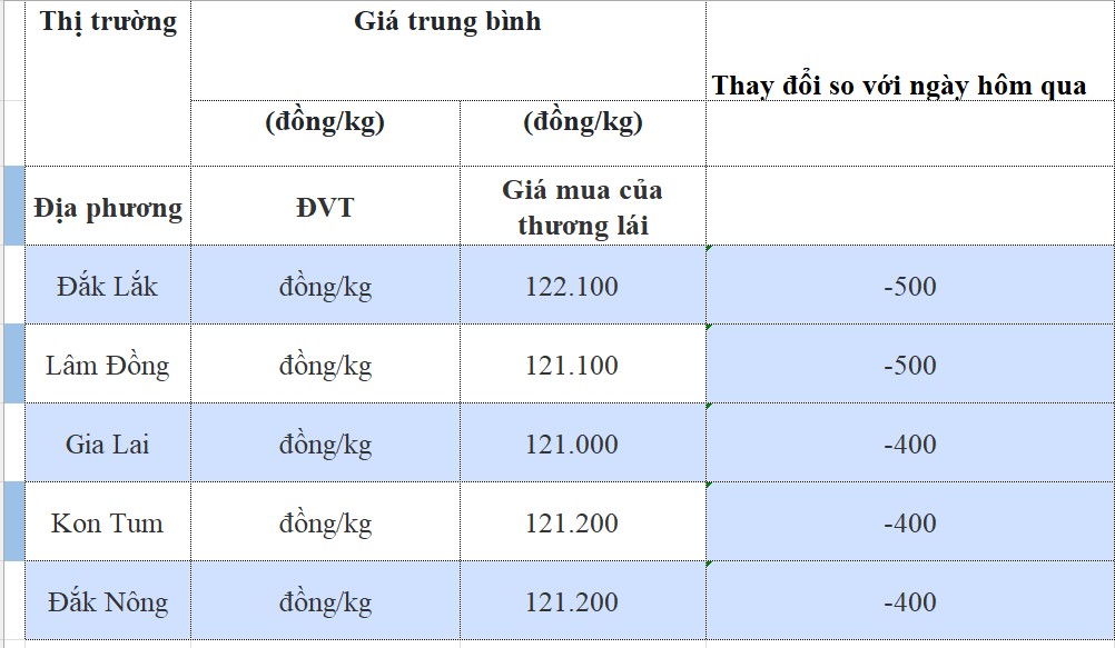 Cụ thể, giá cà phê thu mua tại tỉnh Gia Lai (Chư Prông) là 121.000 đồng giảm 400 đồng/kg so với ngày hôm qua, ở Pleiku và La Grai cùng giá 120.900 đồng/kg. Tại tỉnh Kon Tum ở mức giá 121.200 đồng/kg giảm 400 đồng/kg so với ngày hôm qua; Tại tỉnh Đắk Nông cà phê được thu mua với giá 121.200 đồng/kg giảm 400 đồng/kg so với ngày hôm qua.