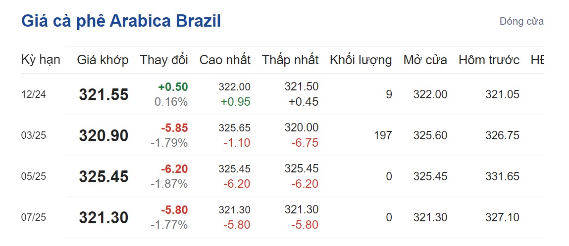 Giá cà phê Arabica Brazil sáng ngày 29/9/2024 tăng, giảm trái chiều. Cụ thể, kỳ hạn giao hàng tháng 12/2024 là 321.55 USD/tấn, tăng 0.16%; kỳ giao hàng tháng 3/2025 là 320.90USD/tấn (giảm 1.79%); kỳ giao hàng tháng 5/2025 là 325.45 USD/tấn, giảm 1.87% và giao hàng tháng 7/2025 là 321.30 USD/tấn, giảm 1.77%.