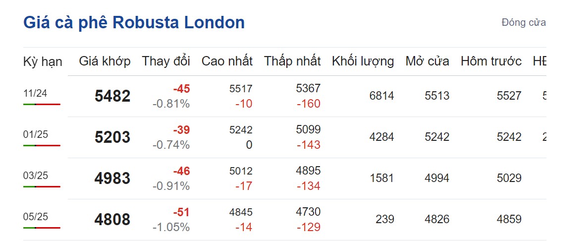 Kết thúc phiên giao dịch, giá cà phê Robusta trên sàn London ngày 30/9/2024 lúc 4h30 giao dịch ở mức 4.808 - 5.482 tấn. Cụ thể, kỳ hạn giao hàng tháng 11/2024 là 5.482 USD/tấn, giảm 45 USD/tấn; kỳ hạn giao hàng tháng 1/2025 là 5.203 USD/tấn, giảm 39 USD/tấn; kỳ hạn giao hàng tháng 3/2025 là 4.983 USD/tấn, giảm 46 USD/tấn và kỳ hạn giao hàng tháng 5/2025 là 4.808 USD/tấn, giảm 51 USD/tấn.