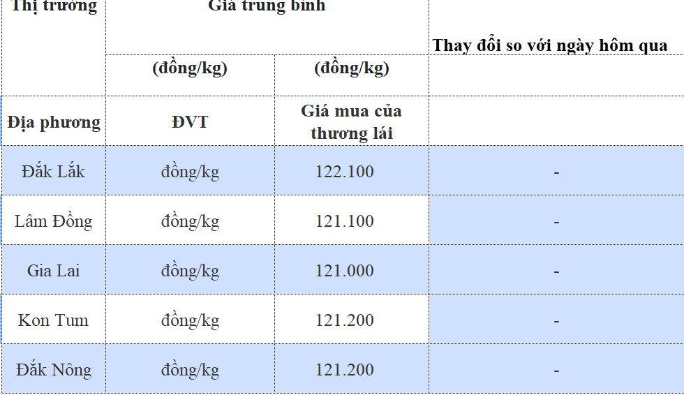 Cụ thể, giá cà phê thu mua tại tỉnh Gia Lai (Chư Prông) là 121.000 đồng, ở Pleiku và La Grai cùng giá 120.900 đồng/kg. Tại tỉnh Kon Tum ở mức giá 121.200 đồng/kg. Tại tỉnh Đắk Nông cà phê được thu mua với giá 121.200 đồng/kg.