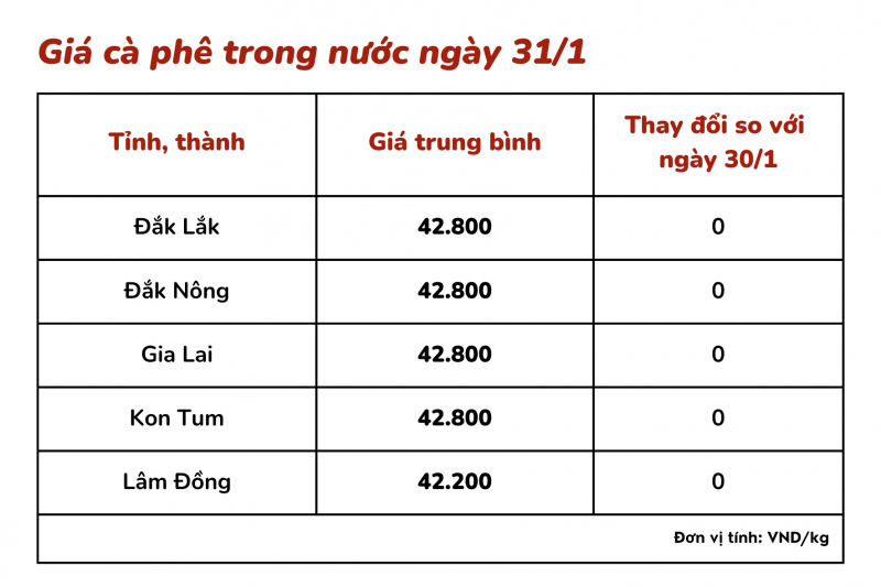 | Giá cà phê hôm nay 31/1 dao động từ 42.200 - 42.800 đồng/kg |