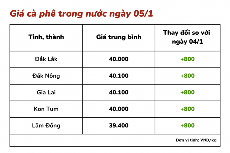 | Giá cà phê trong nước hôm nay 5/1 dao động từ 39.400 – 40.100 đồng/kg. |