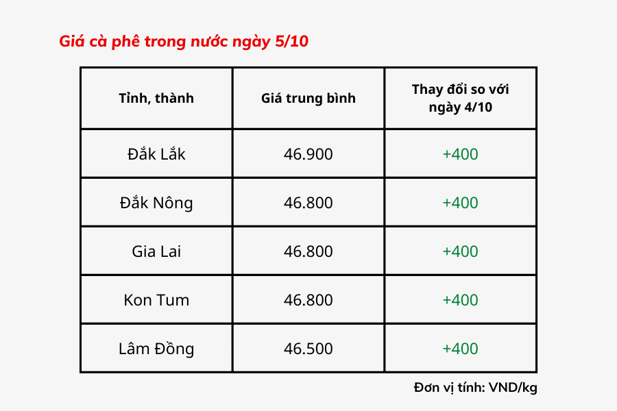 | Giá cà phê trong nước hôm nay 5/10 dao động ở mức 46.500 - 46.900 đồng/kg, tăng 400 đồng/kg so với hôm qua (ngày 4/9). |