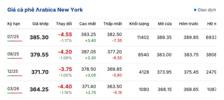 Tương tự, giá cà phê Arabica trên sàn New York sáng sớm ngày 8/5 quay đầu giảm, mứuc giảm từ 3,75 - 4,55 cent/lb so với phiên giao dịch trước đó, dao động 363.50 - 393.25 cent/lb. Cụ thể, kỳ giao hàng tháng 7/2025 là 385.30 cent/lb; kỳ giao hàng tháng 9/2025 là 379.55 cent/lb; kỳ giao hàng tháng 12/2025 là 371.70 cent/lb và kỳ giao hàng tháng 3/2026 là 364.25 cent/lb.