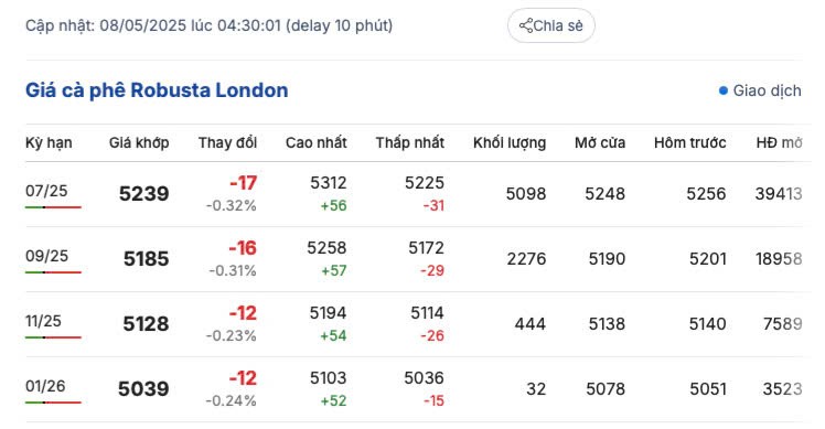 Trên sàn London, vào lúc 4 giờ 30 phút ngày 8/5/2025, kết thúc phiên giao dịch giá cà phê Robusta tiếp đà giảm nhẹ, mức giảm từ 12 - 17 USD/tấn so với phiên giao dịch hôm qua, dao động 5.036 - 5.312 USD/tấn. Cụ thể, giá giao hàng tháng 7/2025 là 5.239 USD/tấn; giá giao hàng tháng 9/2025 là 5.185 USD/tấn; giá giao hàng tháng 11/2025 là 5.128 USD/tấn và giá giao tháng 1/2026 là 5.039 USD/tấn.