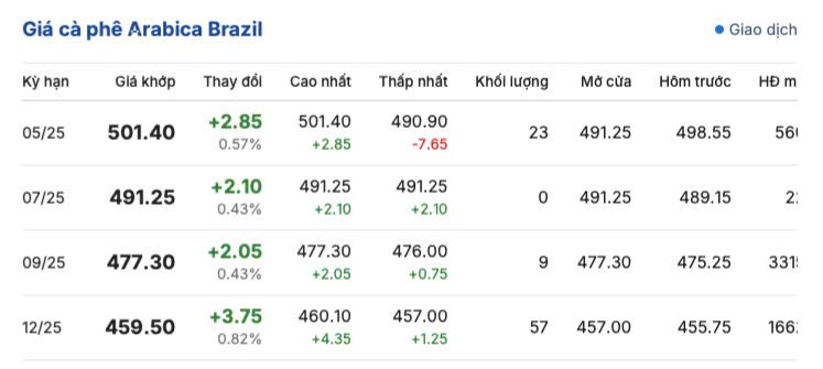 Kết thúc phiên giao dịch, giá cà phê Arabica Brazil tiếp đà tăng so với phiên giao dịch trước đó, mức tăng từ 2,05 - 3,75 USD/tấn, dao động 457.00 - 501.40 USD/tấn. Được ghi nhận như sau: kỳ giao hàng tháng 5/2025 là 501.40 USD/tấn; kỳ giao hàng tháng 7/2025 là 491.25 USD/tấn; kỳ giao hàng tháng 9/2025 là 477.30 và kỳ giao hàng tháng 12/2025 là 459.50 USD/tấn.