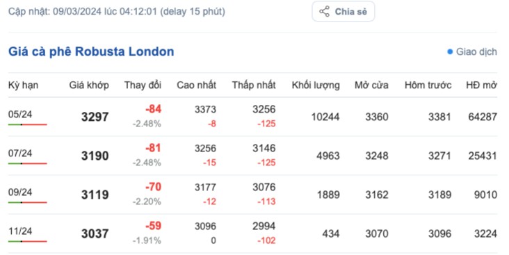 Kết thúc phiên giao dịch, giá cà phê Robusta trên sàn London lúc 4 giờ 12 phút ngày 9/3/2024 có xu hướng giảm, mức giảm từ 59 - 84 USD/tấn, dao động từ 2.994 - 3.373 USD/tấn. Cụ thể, kỳ hạn giao hàng tháng 5/2024 là 3.297USD/tấn; kỳ hạn giao hàng tháng 7/2024 là 3.190 USD/tấn; kỳ hạn giao hàng tháng 9/2024 là 3.119 USD/tấn và kỳ hạn giao hàng tháng 11/2024 là 3.037 USD/tấn.