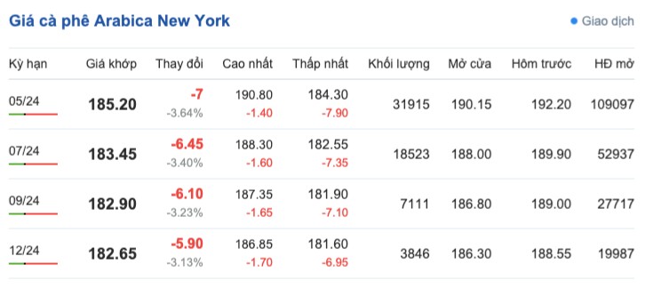 Cà phê Arabica trên sàn ICE Futures US (sàn New York) mở cửa lúc 16:15 và đóng cửa lúc 01:30 (hôm sau), giờ Việt Nam.