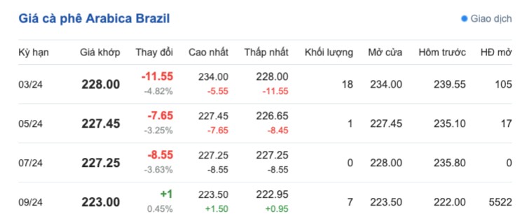 Giá cà phê Arabica Brazil sáng ngày 9/3/2024 sắc đỏ chiếm ưu, xu hướng giảm giá thể hiện rõ qua các kỳ hạn giao hàng. Cụ thể, kỳ hạn giao hàng tháng 3/2024 là 228.00 USD/tấn; kỳ giao hàng tháng 5/2024 là 227,45 USD/tấn; kỳ giao hàng tháng 7/2024 là 227,25 USD/tấn và giao hàng tháng 9/2024 là 223,00 USD/tấn.
