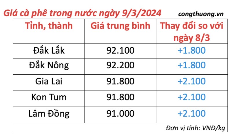 Giá cà phê trong nước được cập nhật lúc 4h12 phút ngày 9/3/2024 như sau, giá cà phê trong nước liên tục tăng "phi mã" những phiên giao dịch vừa qua và lập đỉnh giá mới lịch sử, mức tăng khoảng 1.800 - 2.100 đồng/kg, vượt mốc 92.000 đồng/kg. Hiện giá mua trung bình tại các tỉnh Tây Nguyên là 92.000 đồng/kg, giá mua cao nhất tại tỉnh Đắk Nông là 92.200 đồng/kg.