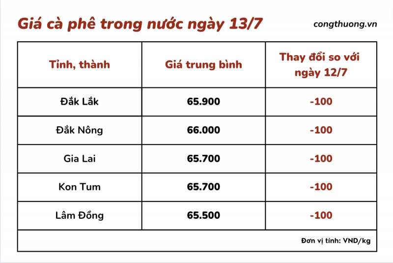 Giá cà phê trong nước hôm nay ngày 13/7/2023 tại các tỉnh khu vực Tây Nguyên giảm nhẹ 100 đồng/kg, hiện dao động ở mức 65.500 - 66.000 đồng/kg