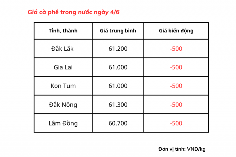 Giá cà phê trong nước hôm nay 4/6 tại các tỉnh khu vực Tây Nguyên giảm 500 đồng/kg.