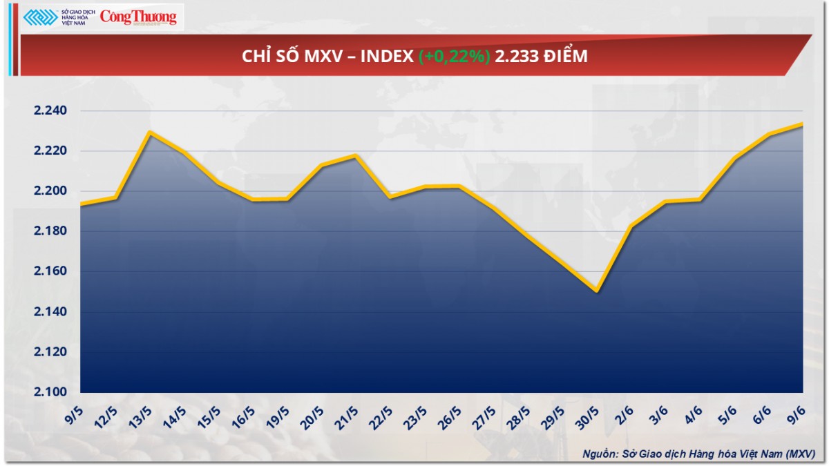 Theo Sở Giao dịch Hàng hóa Việt Nam (MXV), sắc xanh bao phủ 3 trên 4 nhóm hàng nguyên liệu thế giới trong ngày giao dịch đầu tuần. Đáng chú ý, giá hai mặt hàng kim loại quý tiếp đà tăng mạnh, đồng thời thiết lập thêm kỷ lục mới. Trong khi đó, giá hai mặt hàng cà phê cũng quay đầu phục hồi. Đóng cửa, chỉ số MXV-Index tăng 0,2% lên mức 2.233 điểm.