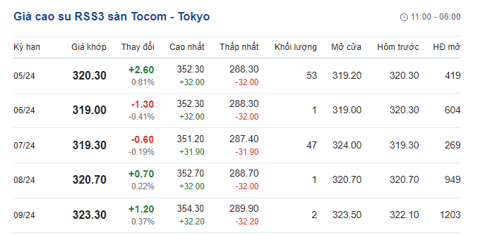 Cụ thể, giá cao su RSS3 hợp đồng kỳ hạn giao tháng 5/2024 ở mức 320,3 JPY/kg, tăng 0,81%, tương đương tăng 2,6 JPY/kg so với cuối phiên liền trước. Kỳ hạn giao hàng tháng 6/2024 là 319 JPY/kg, giảm 0,41%. Kỳ hạn giao hàng tháng 7/2024 là 319,3 JPY/kg, giảm 0,19%. Kỳ hạn giao hàng tháng 8/2024 là 320,7 JPY/tấn, tăng 0,22%. Kỳ hạn giao hàng tháng 9/2024 là 323,3 JPY/kg, tăng 0,37%.